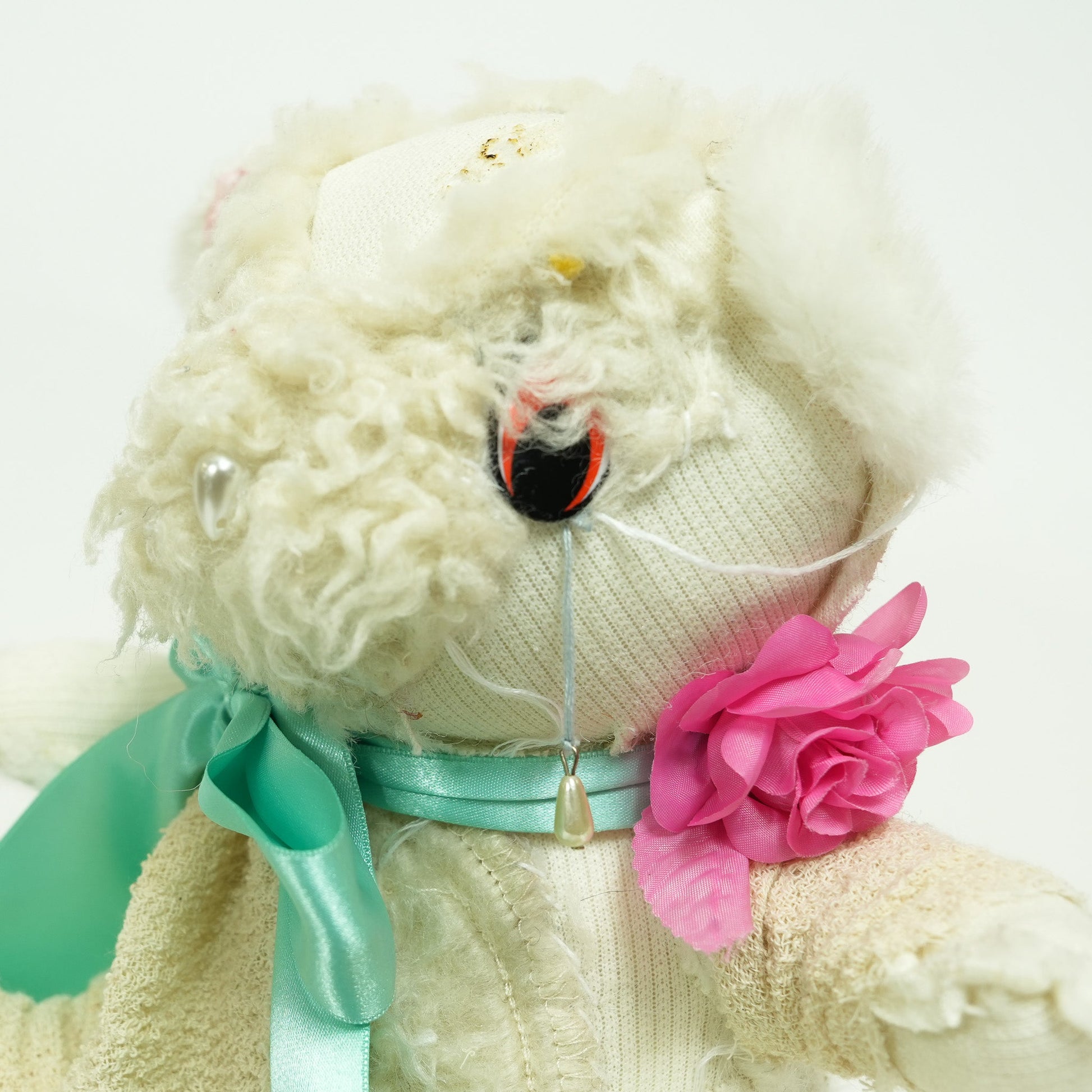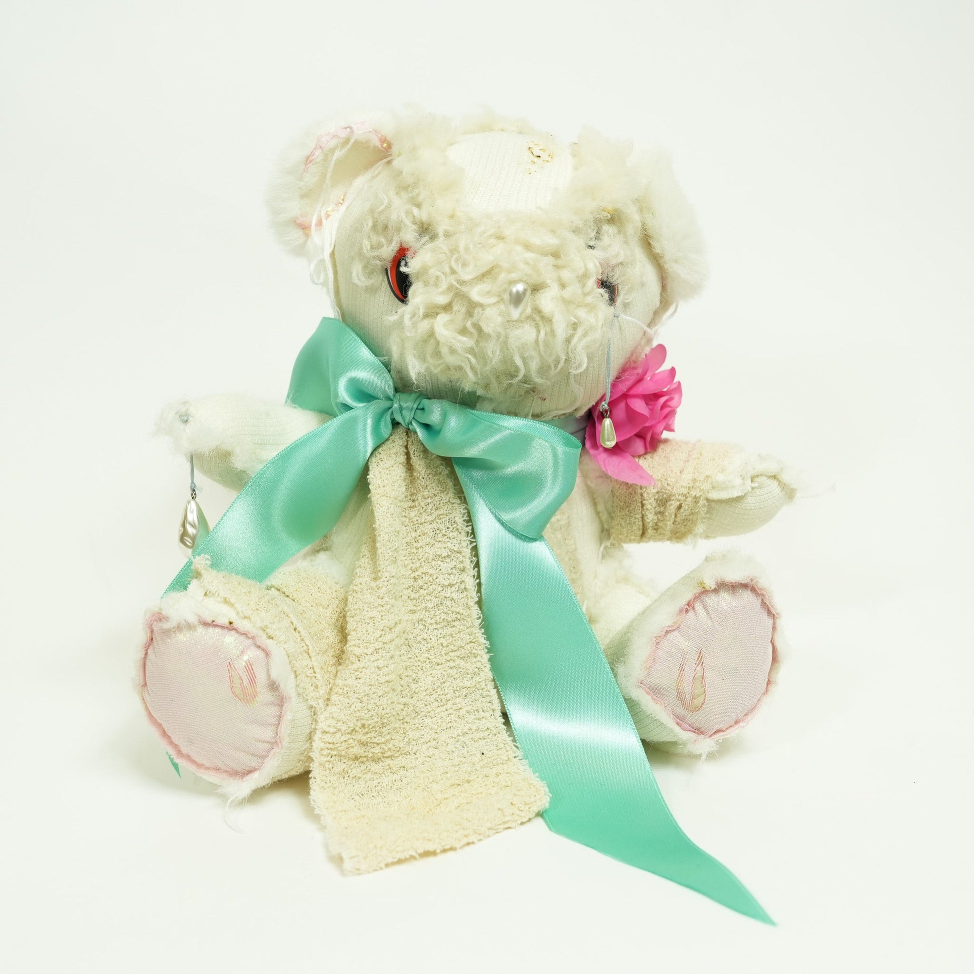 Soft toy, organic kapok, glass pearl tears, satin ribbon, flower detail, bandages.