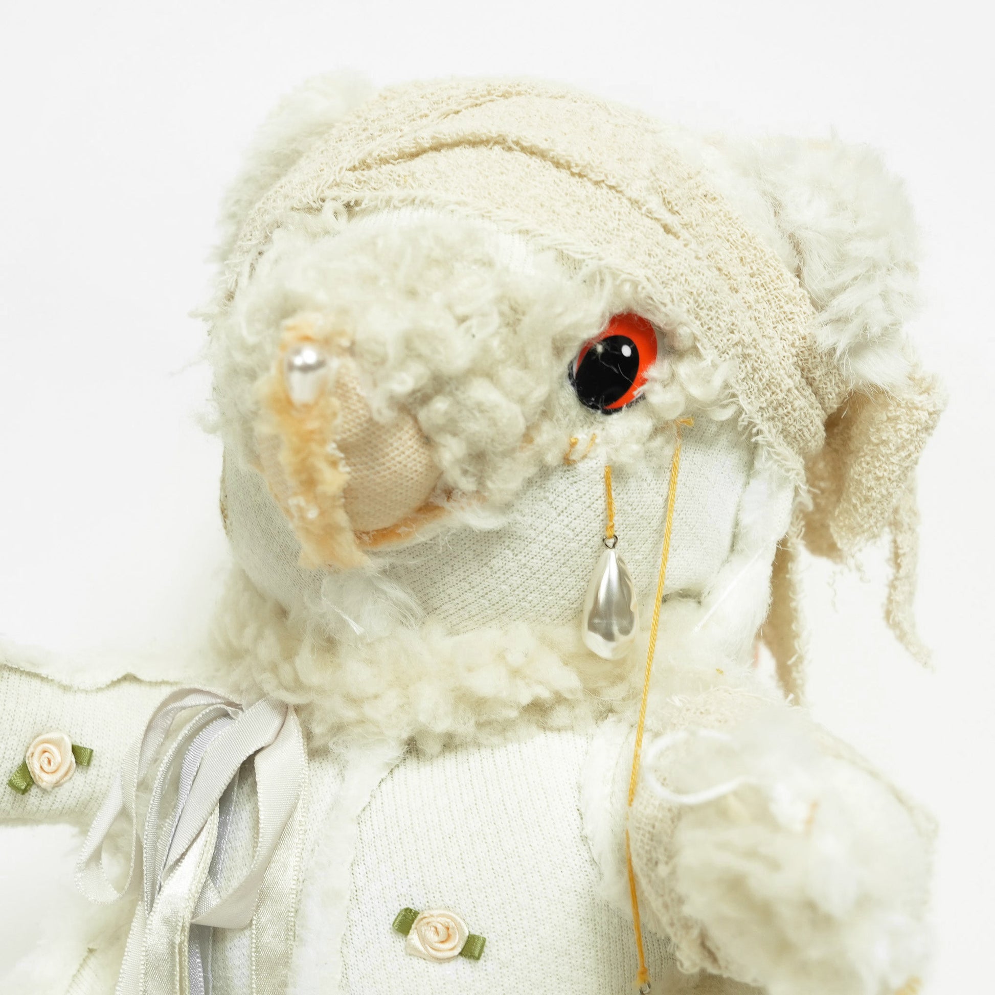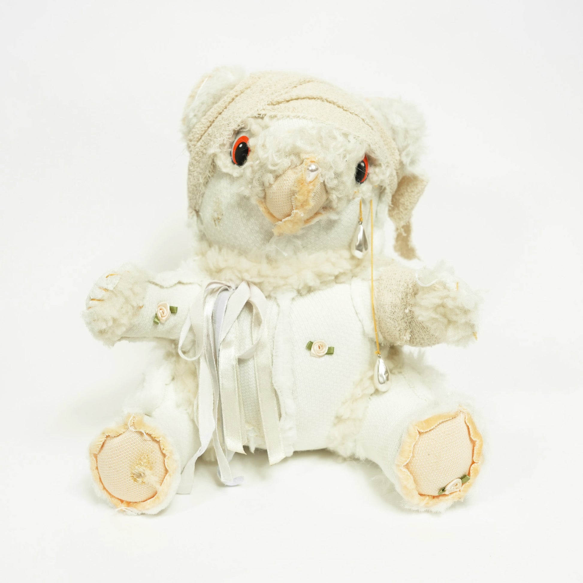 Soft toy, organic kapok, glass pearl tears, satin ribbon, silk roses, bandages.