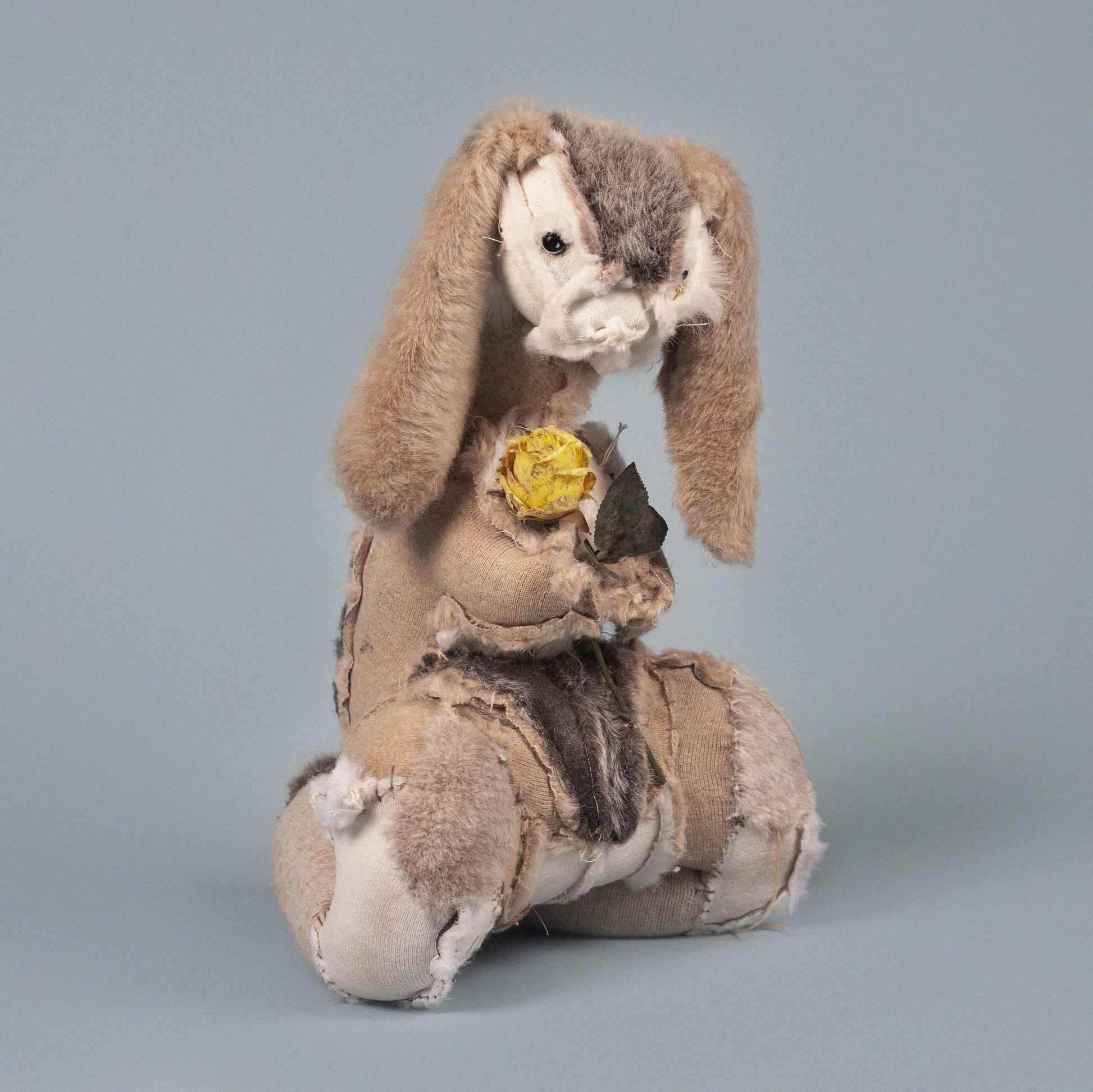 Kneeling hare in mourning constructed from salvaged bunnies, holding a salvaged rose from a cemetery.