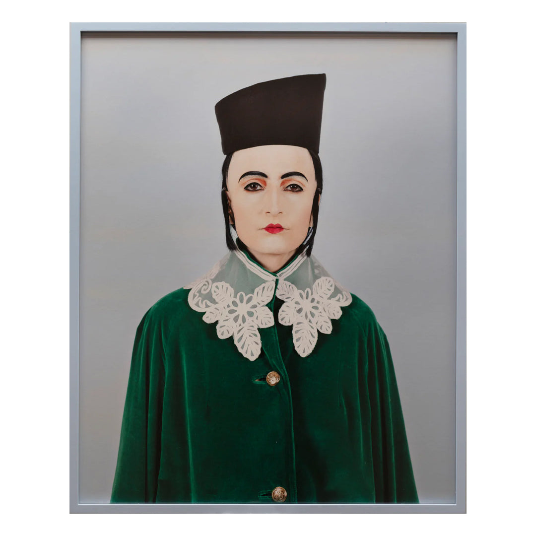 In ‘Heart Throbs’ Shirin explores gender representation and cultural exchange between Europe and Iran as inspired by 19th century Qajar paintings. Beauty standards at the time diverged from the modern gendered convention, with men wearing makeup and women fixing side-burns to their face. Using her face as a stage, she embodies the archetype of Amrad (the adolescent male), Amradnuma (the adult male) and Fukuli (the male who mimics the look of the European dandy) in these visually striking portraits.